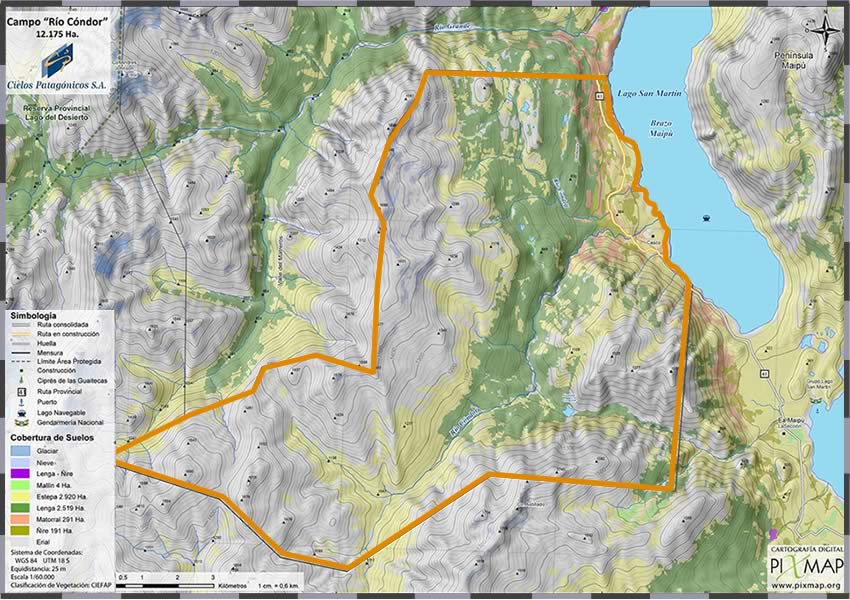 Tras recorrer 48 kms. y cruzar varias tranqueras de estancias vecinas, transitando la margen sur del lago San Martín, se llega a Río Cóndor.